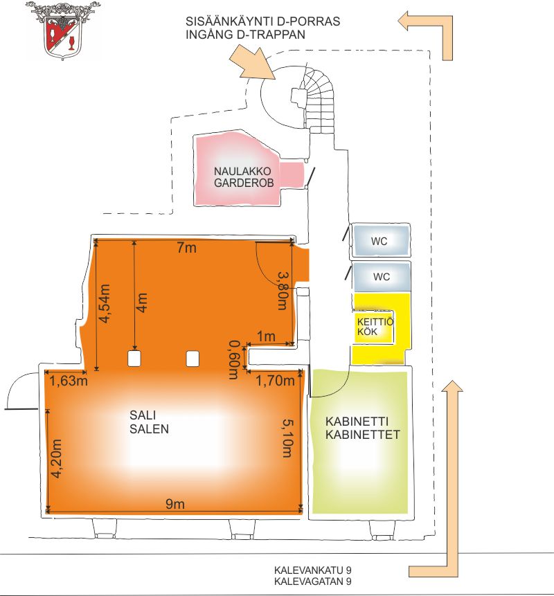 Juhlatilamme koostuvat salista, kabinetista ja keittiöstä. Tila on mitoitettu 50 hengelle ja voit varata joko koko kellarin tai vaihtoehtoisesti erikseen joko vain salin tai kabinetin, johon mahtuu 10 henkeä. Vuokramaalla koko kellarin tilat ovat yksistään sinun ja vieraittesi käytössä, ja keittiöhenkilökunta saa enemmän työtilaa. Jos taas haluat istua iltaa pienemmällä joukolla, voit varata vain kabinetin. Toimiva keittiömme ja astiasto ovat kummassakin tapauksessa käytettävissäsi.